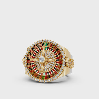 This stunning ring features a large Roulette Wheel as the center, made entirely of both 10K yellow and 10K white gold. Its face embodies the essence of a casino, giving you a taste of the exhilarating atmosphere. The band is cleverly designed to resemble a watchband, complete with solid links, staggering from white gold to yellow gold. There is also iced out money signs running down the sides of the band.  The stones are ethically sourced lab grown diamonds.